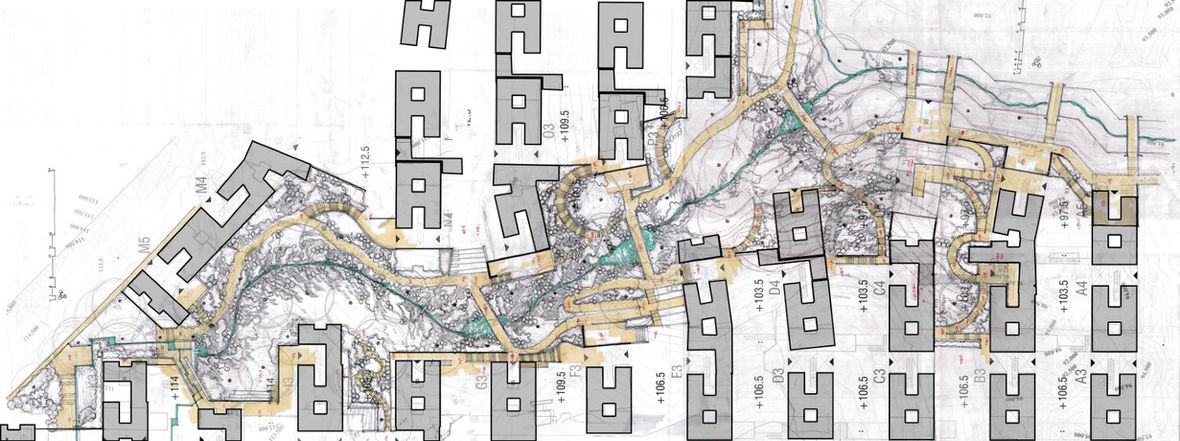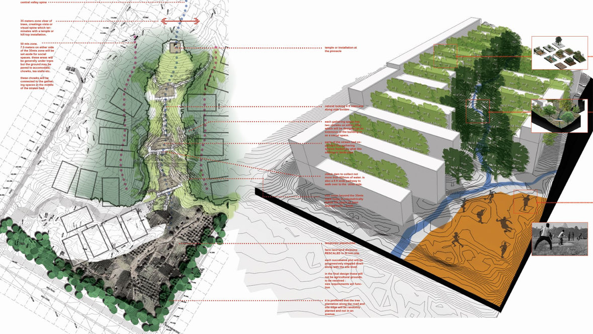 In our design proposal, the flat stream bed at the bottom is reinterpreted as a maidan; and the upstream river and its riparian corridor, is designated as a natural eco-system. The idea of these two landscape characters are used to structure the open spaces and building occupancy.