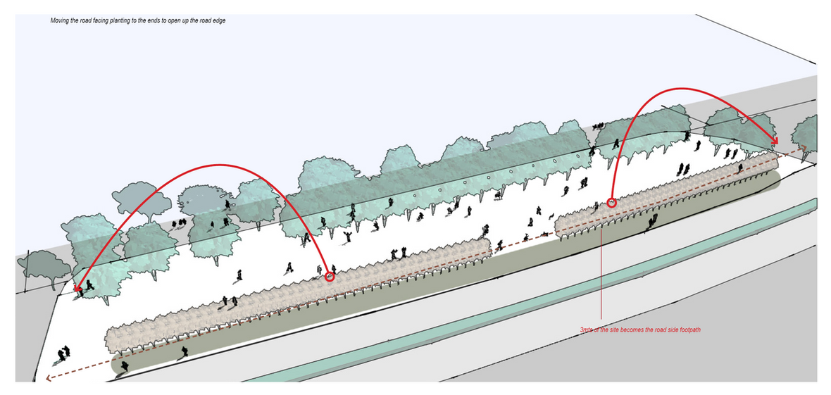 The Site should perform as an open Urban Public Realm, For this reason the planting fronting the road edge is transplanted to either side of the site. This allows the plaza to open up to the road. A 3mts wide footpath connecting two ends of the site is installed, hopefully other developments along the Necklace roads will also provide for a footpath along their site, and continue this pedestrian movement.